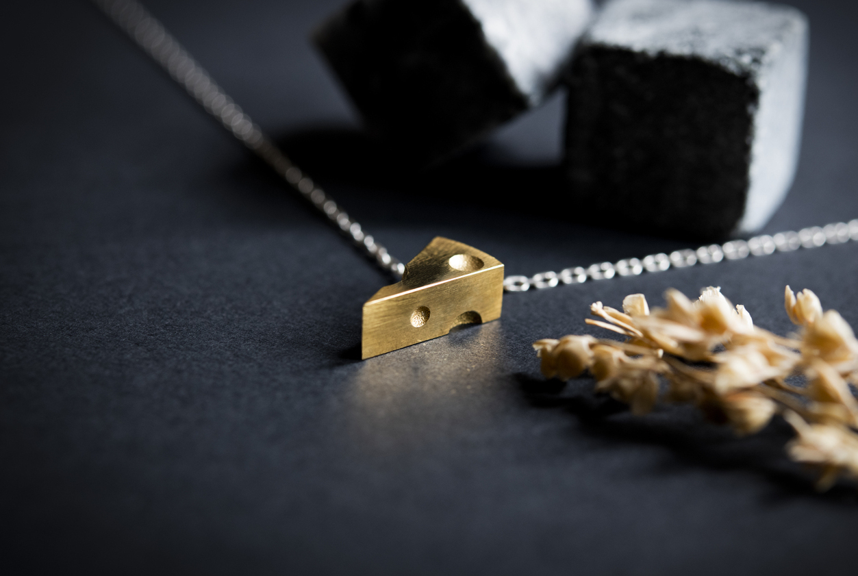 Кулон в форме сыра из жёлтого золота с матовой фактурой для реалистичности